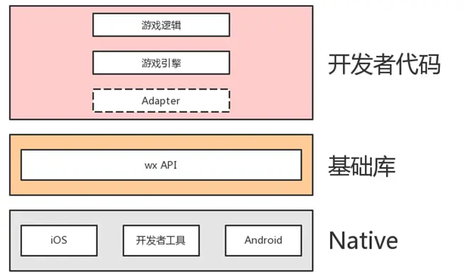 小游戏的运行环境在IOS上是Javascript Core, 在Andriod上是 V8,没有DOM和BOM的运行环境。 Adapter,通过wx api模拟BOM、DOM的代码库。