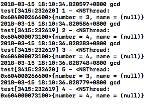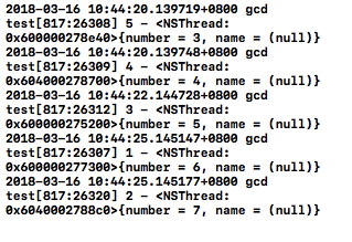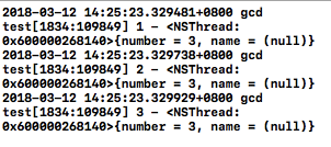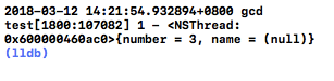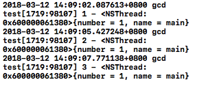 可以看出上面代码执行流程顺序符合需求,那么来分析下:创建一个串行队列,注意这里不能用并发队列,我后面会来讲解,创建一个信号量,初始化信号量为1,dispatch_async异步函数,不阻塞当前主队列,将block里的任务追加进自定义串行队列(存放在此时串行队列最后面),这里三个异步函数,三个block任务按顺序追加进同一个串行队列,串行队列上的任务需要按顺序一个一个来执行,前面的任务执行完毕,后面的任务才可以开始执行,串行队列只有一个线程,这三个block任务都是由同一个子线程来执行。