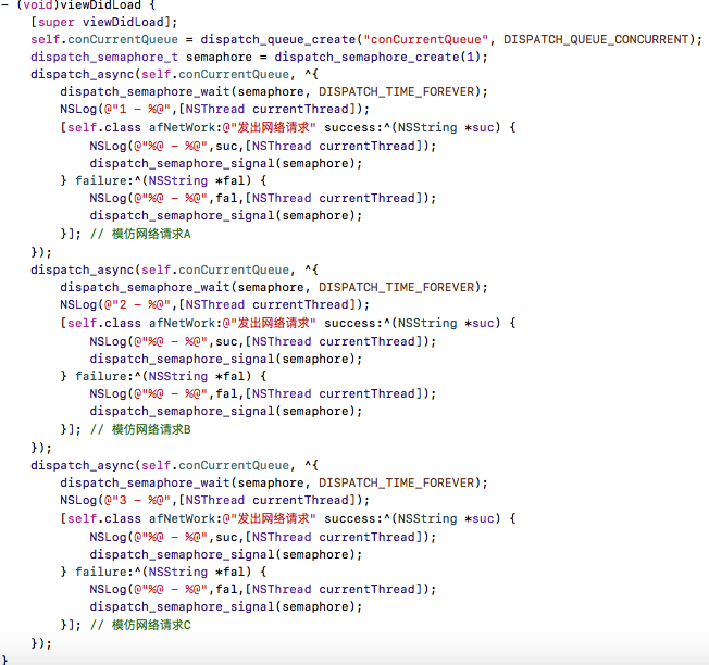 这样运用信号量机制,可以完美控制网络请求执行顺序。当然,有更加简便且实际的方法,就是在网络请求的block回调里调用下一个网络请求,这样同样可以实现需求。我这里只是为了通过这个例子讲解下怎么运用信号量。