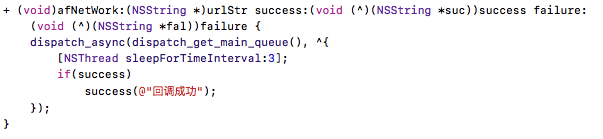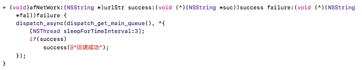 现在开始执行第一个block任务,因为信号量初始化为1,所以dispatch_semaphore_wait不会阻塞当前线程,会继续往下执行,同时将信号量减1,这样此时信号量则为0了。然后进行网络请求,该网络请求是我自定义的模仿网络请求操作,这里我只设有成功回调,没有失败的回调。在afNetWork:网络操作方法里,我调用了异步函数,因为真实的网络请求就是异步的,然后让回调所在的block任务追加进主队列,由主线程来执行,在block任务里,让主线程阻塞3秒,才执行回调操作。这样就相当于实际上的网络请求3秒后收到回调。