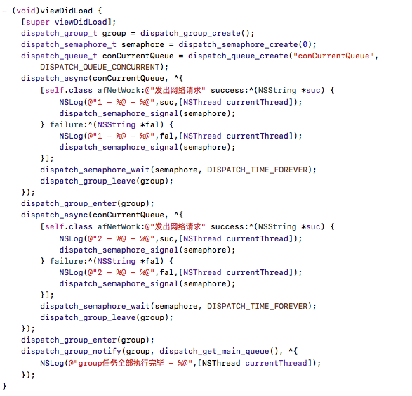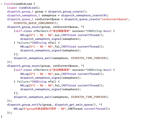 来分析下流程:两个dispatch_group_async异步函数,将block任务追加进自定义并发队列中,因为两个网络请求任务无需按顺序执行,所以用并发队列,并发执行网络请求,提高效率。将该并发队列加入队列组中,将要进行的UI操作(这里就用打印日志来表示吧)追加进主队列并用dispatch_group_notify控制,只有队列组中的两个block任务执行完毕才能打印最后一条日志。因为网络请求是异步的,所以这里用信号量来控制,使得网络请求回调成功后才算真正执行完block任务,上面已经讲解过信号量了,这里就不多说了。基本流程就这样子,很完美实现需求。