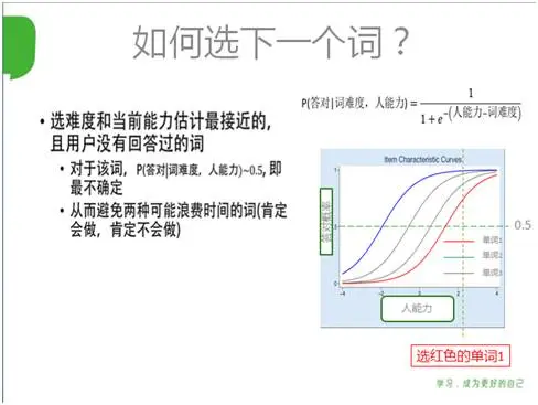 选难度和当前能力估计最接近的,且用户没有回答过的词。对于该词,P(答对|词难度,人能力)~0.5,即最不确定,从而避免两种可能浪费时间的词。