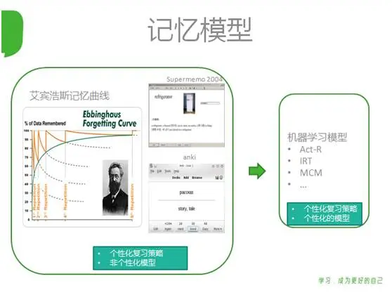 基于记忆模型的个性化闯关路径:在背单词的过程中,根据每个人的记忆特点计算记忆曲线,利用这个记忆曲线来安排合理的关卡。基于记忆模型的个性化闯关路径的算法模型经历三个主要阶段:艾宾浩斯记忆曲线、间隔效应、Act-R;接下来正实施MCM模型。第一段(艾宾浩斯记忆曲线):主要构建群体艾宾浩斯记忆曲线及每个学习者的个性化记忆曲线;第二阶段考虑间隔效应进行构建曲线模型;第三阶段基于Act-R算法建模。