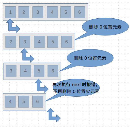 __iter__(),获取迭代器对象执行__next__()方法向后迭代列表 - 列表是使用顺序表实现的,当删除前面的元素时,后面的元素会向前移动,补上前面的空值位置,而next的位置不变(后面通过画图解释)