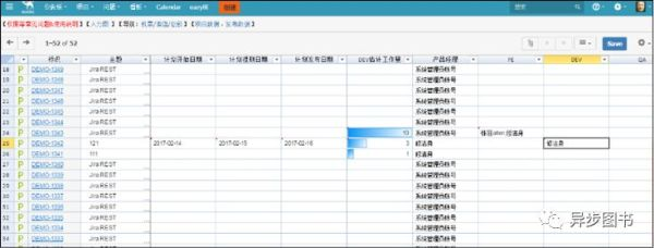 - 在线Excel。在线项目管理系统另外一个比较让人诟病的地方是:批量修改任务数据时,需要一条条分别编辑和保存,不如Excel操作方便。因此,这里提供了类似Excel的在线表格编辑功能(如图8-7所示),支持Crtl+C插入行,Ctrl+V删除行、拖动排序等常见的Excel操作,同时可以在编辑后批量提交和保存,大大提高了信息录入的效率。