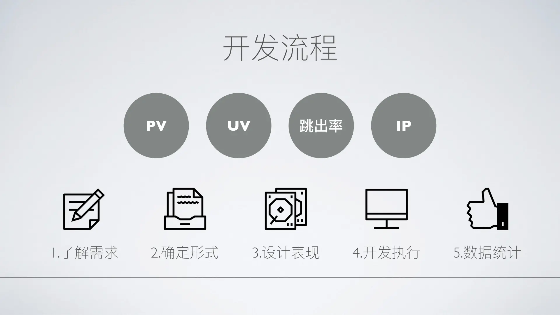 H5的开发流程和普通的网站开发流程基本类似,不过需要着重介绍一下数据统计这方面,为了更好的跟进营销方案,就需要通过数据进行分析,做出更好的调整和经验积累,PV:点击量,UV:独立用户访问量这几个名词。