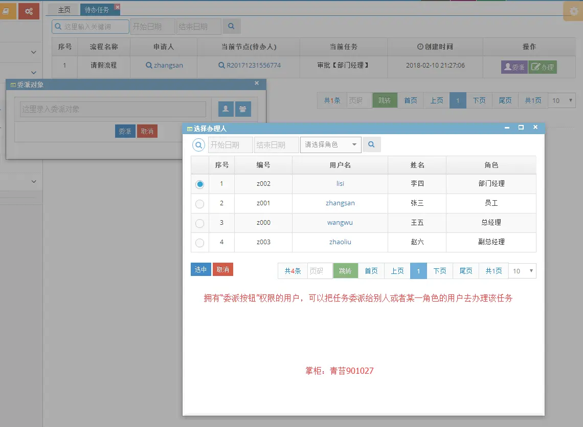 5.待办任务 :查看本人个人任务以及本角色下的任务、办理、驳回、作废、指派一下代理人