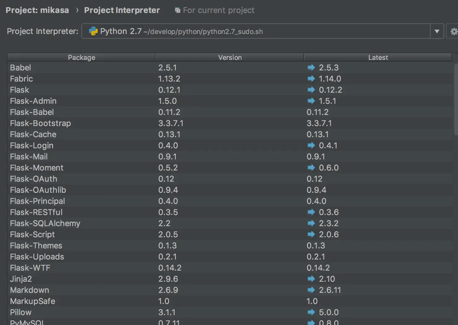 启动pycharm,打开工程,选择菜单命令Preferences — Project Interpreter,选择Project Interpreter右边的齿轮图标,在弹出菜单中选择Add Local,然后在文件选择对话框中选中刚刚创建的python2.7_sudon.sh,确定后即可