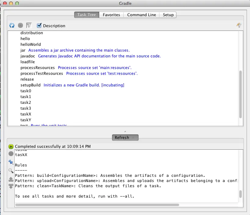 通过这个gui界面可以很方面的执行gradle的各种命令,还可以将常用的命令保存为favorites。该gui的配置信息默认被存储在当前项目的gradle-app.setting文件中。