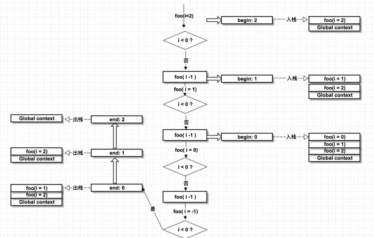 上述goo被声明后,通过()运算符强制直接运行了。函数代码就是调用了其自身3次,每次是局部变量i增加1。每次goo函数被自身调用时,就会有一个新的执行上下文被创建。每当一个上下文执行完毕,该上下文就被弹出堆栈,回到上一个上下文,直到再次回到全局上下文。整个过程抽象如下图: