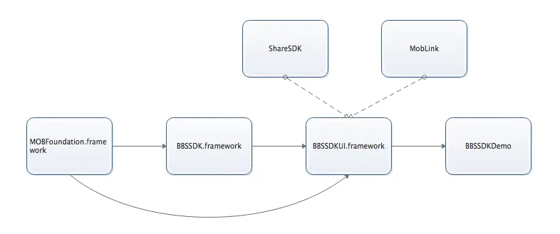 BBSSDK.framework是数据framework,内部封装了所有数据接口.BBSSDK.framework可以独立作为SDK进行使用,只需要自己写UI,调用BBSSDK.framework,就能够实现论坛项目的开发.不过由于BBSSDK.framework引用了MOBFondation.framework,所以在使用BBSSDK.framework时,需要添加MOBFondation.framework.
