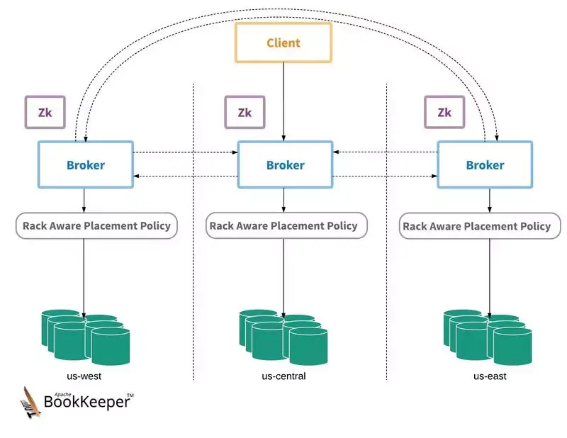 使用同步地域复制的 Pulsar 环境包含一个全局的 Zookeeper(一整套 ZooKeeper 环境将跨越多个数据中心运行),一个在多个数据中心内运行的 Bookie 集群,以及一个同样在多个数据中心内运行的 Broker 集群。此外需要为 BookKeeper 配置使用区域感知安放策略,Pulsar Broker 将使用该策略跨越数据中心存储数据,同时为写操作提供一致性保障(例如确认之前至少写入到两个数据中心)。