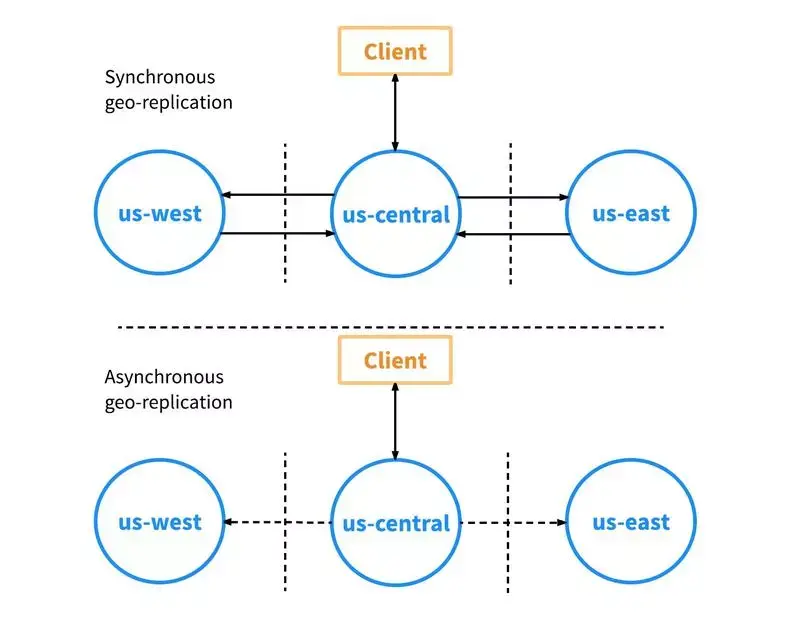 本例假设了 3 个数据中心:us-west、us-central 和 us-east,客户端向 us-central 发出写操作请求。如果使用同步地域复制,客户端向 us-central 发起请求后,写入 us-central 的数据会复制到另外两个数据中心:us-west 和 us-east。通常只有在大多数的数据中心确认写操作已成功完成后,客户端才会获得有关该写入请求的确认。也就是说在本例中,至少要求两个数据中心确认写入请求已成功完成。这种机制也叫做“同步地域复制”,因为数据会以同步的方式复制到多个数据中心,客户端必须等待其他数据中心的确认。