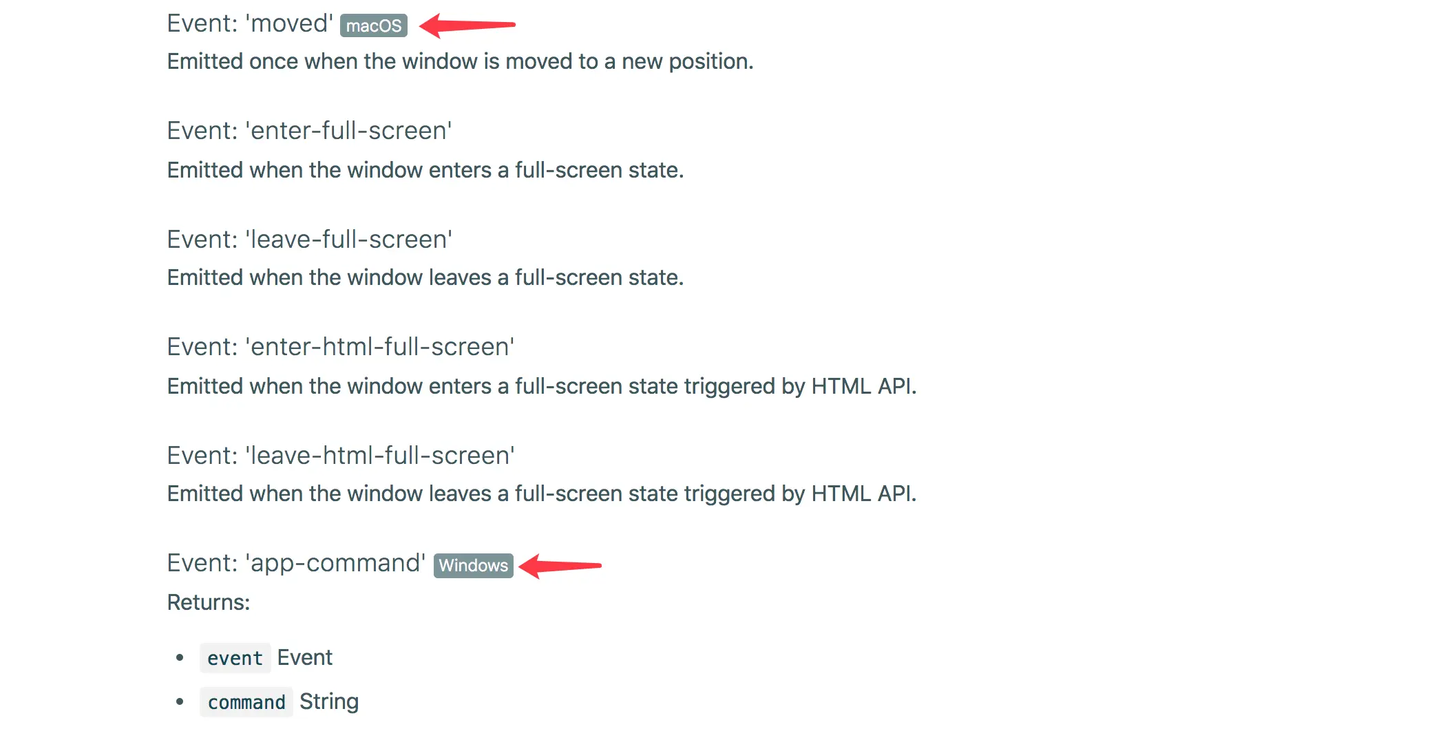在开发electron应用的时候,很多时候我们只注意去查找api名,却容易忽视这个api能够使用的平台。在官方文档里,对于一些独占的api,大多都会有标识标出: