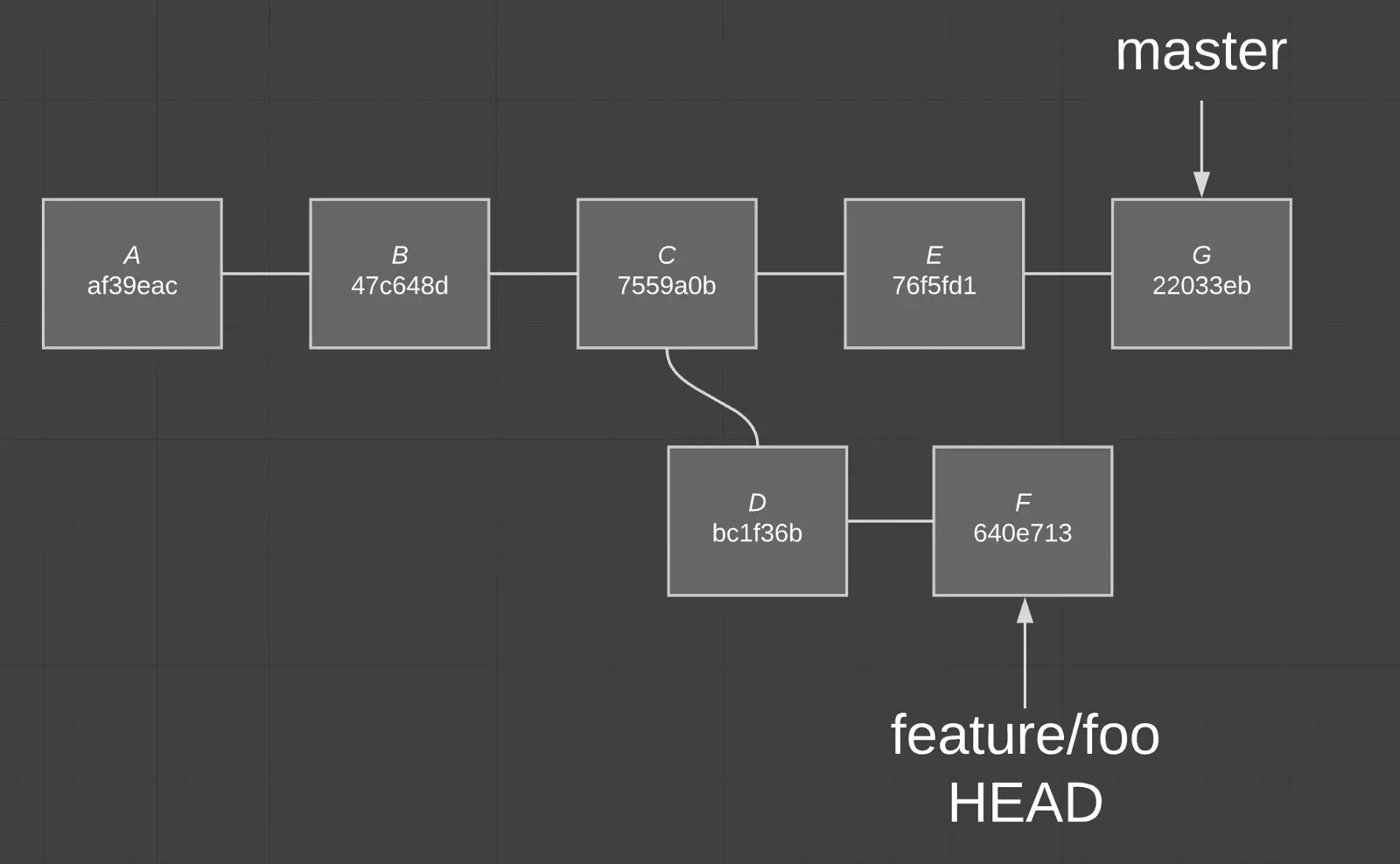 从上图中我们可以看到每一个分支都有 A、B 和 C 这几个提交。master 分支还拥有 E 和 G 提交但是 feature/foo 分支没有。feature/foo 拥有 F 和 D 提交但是 master 分支没有。