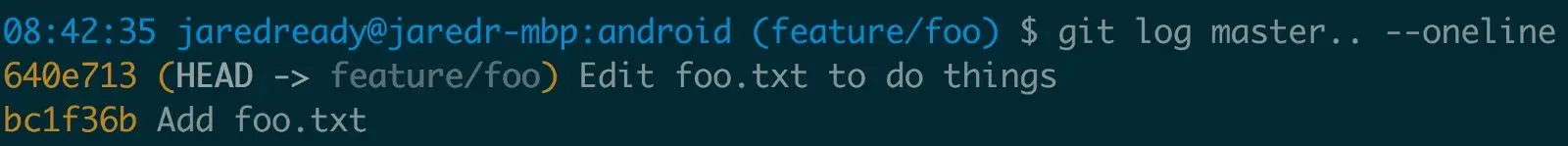 git log master..feature/foo 会 向我们展示 bc1f36b 和 640e713 提交。