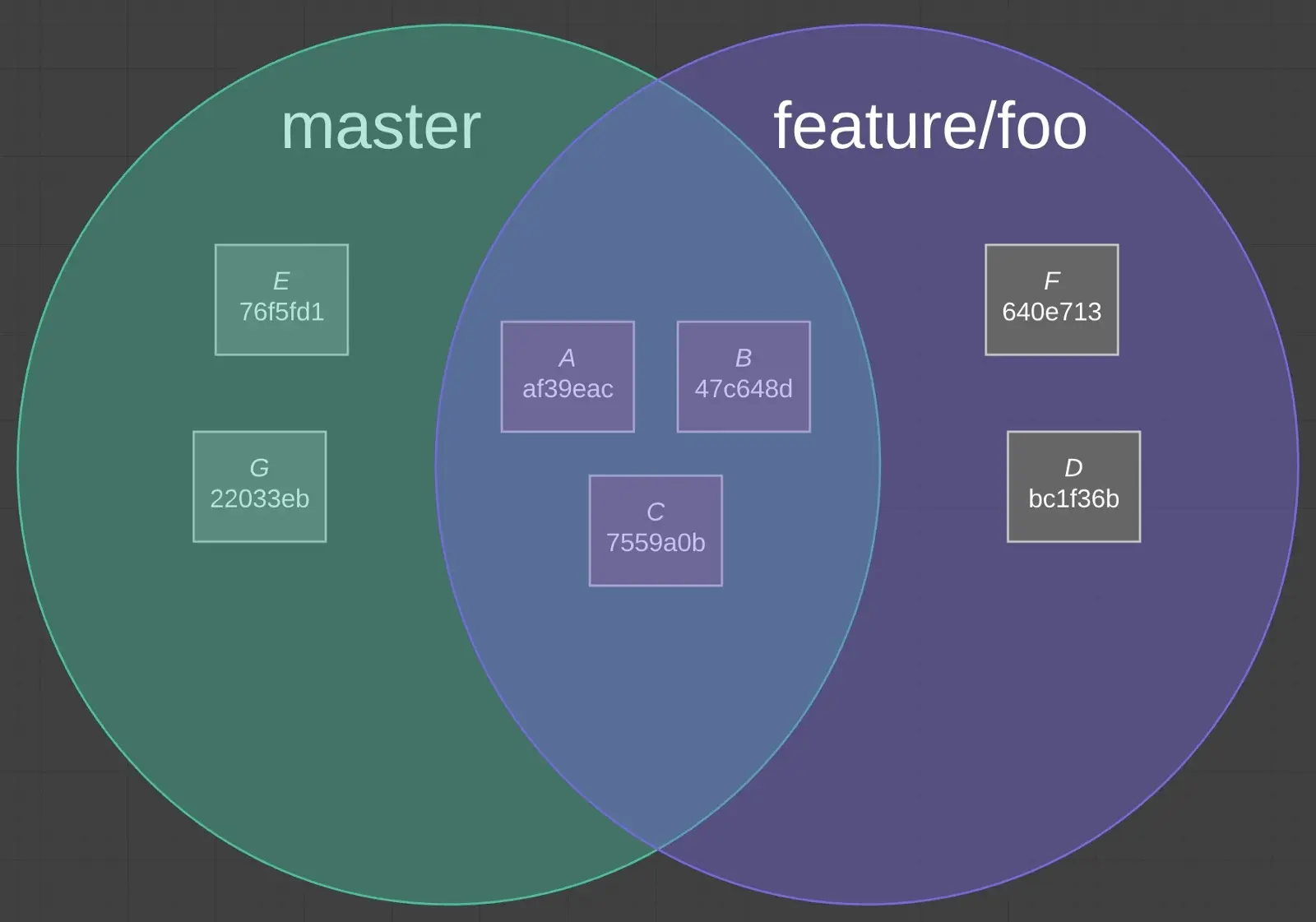 Git 会做一个减法:{commits on feature/foo} — {commits on master},来找出正确的提交。这个结果就是 D 和 F。