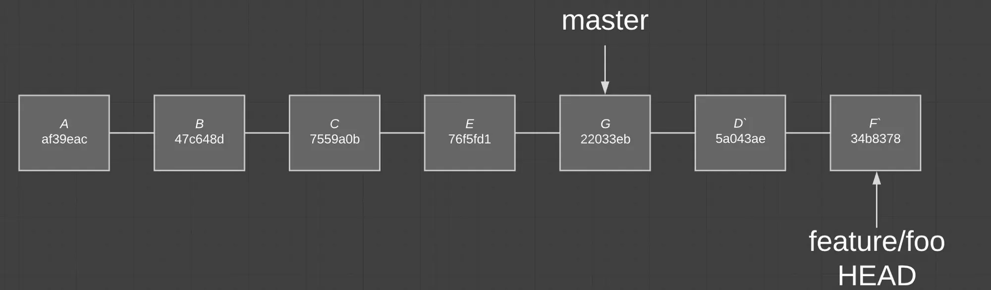 让我们来看一个例子。我们在这个仓库中有两个分支:master 和 feature/foo。feature/foo 是基于 master 分离出去的分支,并且在 feature/foo 分支上产生了一些提交。master 也发生了移动,就像世界不会因为少了你的关注而停滞不前。