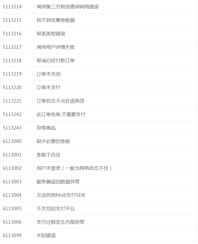 其中,[4113005:用户未登录]较为重要,建议开发者接收到该code时跳转至登录页面,待用户登录后,再调用MobSDK.setUser()接口将用户信息设置给ShopSDK。