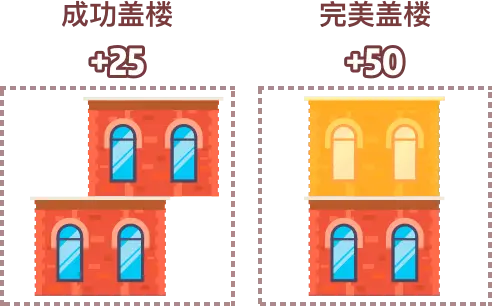 成功盖楼加25分,完美盖楼加50分,连续完美盖楼额外加25分,楼层掉落扣除生命值1,单局游戏共有3次掉落机会
