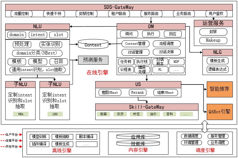 SDS引擎是任务式对话的核心。它接受用户的query,以DM为控制中枢、以NLU为理解中枢、通过US做召回和rank、以NLG包装后输出。目前资讯播报、时区、限行、历史上的今天、单位换算、油价、日历、nba、lbs等技能天猫精灵上线技能触发率97-98%,准确率95%+;