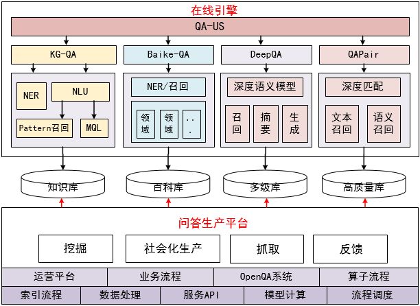 我们当前主要专注于基于海量数据的检索式QA系统,而在系统层面划分为:KG-QA、Baike-QA、DeepQA、PairQA,它们都是对既有知识的搬运整理,但是在数据来源/要求、加工方式、匹配方式、覆盖场景又不尽相同。笔者认为世界的理想终局是结构化的(知识库),但是这个永远无法真正实现,比如信息的持续产生和更新以及自然语义处理的难度,所以需要两个方向同时并行前进。