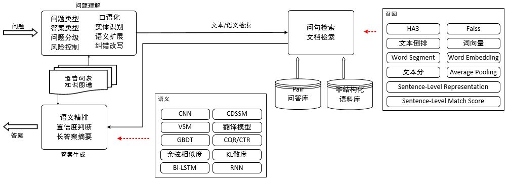 答案生成基于检索端的候选答案,需要通过进一步的精排、答案抽取、置信度计算,最终得到准确、简洁的答案。PairQA,更多的是通过CNN、DSSM、GBDT等机器学习模型和方法做严格的排序 + 置信度计算;DeepQA,面向的是非结构化的文档/社区语料,则需要做更深层次的处理,包括结合Bi-LSTM RNN模型的简洁摘要抽取、同义问题答案间交叉验证、答案相关性验证等。