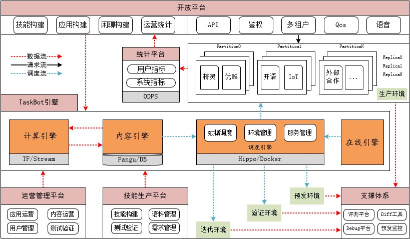 上图为架构体系整体大图。"引擎"负责数据的构建和计算的承载,"平台"负责以引擎为核心构建的闭环解决方案(生产、多租户消费、运营、需求管理等)。系统的落地,得以于搜索多年的积累沉淀。该系统完全与搜索业务解耦,承载了天猫精灵等业务方的流量(以及双十一晚会直播问答)。下面会分别介绍神降临平台、TaskBot引擎、QABot引擎。