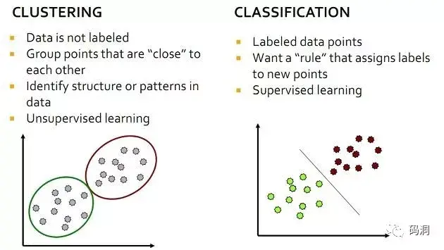 分类算法和聚类比较类似,都是将输入数据赋予一个标签类别。区别是分类算法的分类是预先确定的,有明确含义的。而聚类的标签是从输入数据本身的分布中提取出来的一种抽象的类别。聚类是无监督算法,而分类是有监督的,除了输入数据x外,还有标签y。