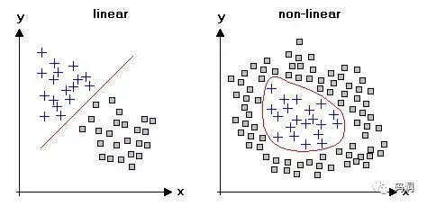 分类算法同样分为线性分类和非线性分类算法,线性可分是指可以用二维空间的直线或者多维空间的平面将输入数据分开,非线性就是线性不可分。