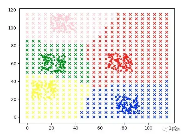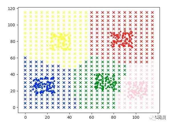 c=[colors[ci] for (x, y), ci in pcolors], marker='x')