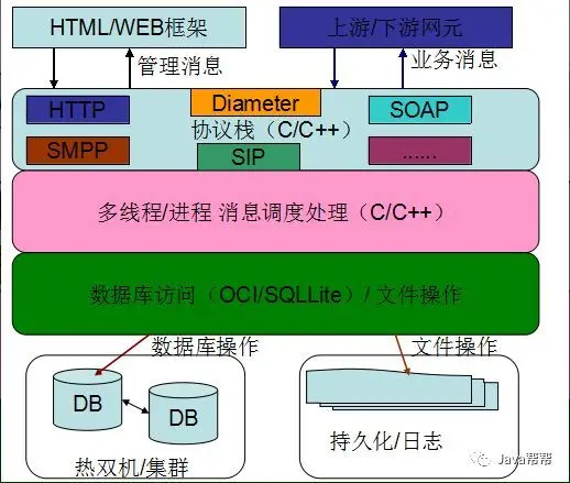大多数的软件都运行在服务端,对外提供高性能、低时延和高并发的系统调用,协议栈大多数都采用电信私有协议栈,对于部分有前台管理Portal的系统,往往基于原生的HTML或者Struts等WEB框架开发,通过HTTP协议与后端进行交互,它的逻辑架构图如下:
