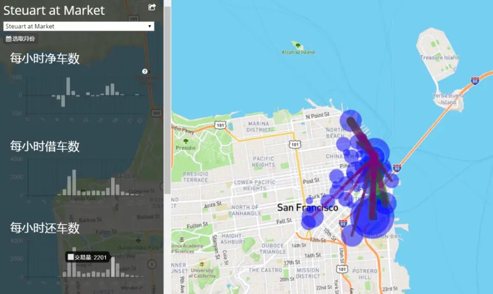1.下图为某共享单车在旧金山某热门区域的车辆借还情况。通过分析该区域车辆的历史借还数据,单车公司可优化热点时间段的车辆补给。