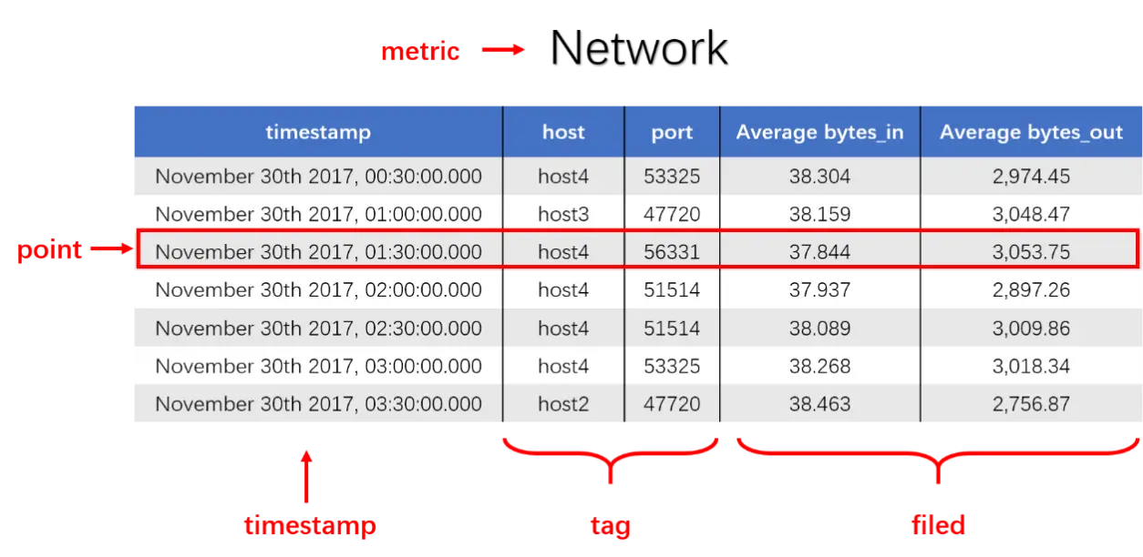 - point: 一个时序数据点,类似于关系型数据库中的 row;