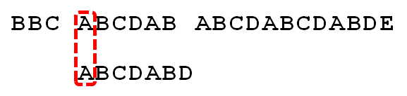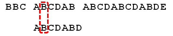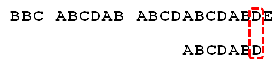 - 5. P[6]处的D再次失配,因为P[6]对应的next值为2,故下一步用P[2]继续跟文本串匹配,相当于模式串向右移动 j - next[j] = 6 - 2 = 4 位。