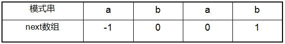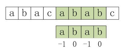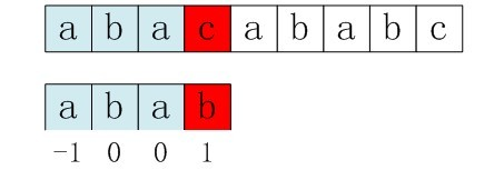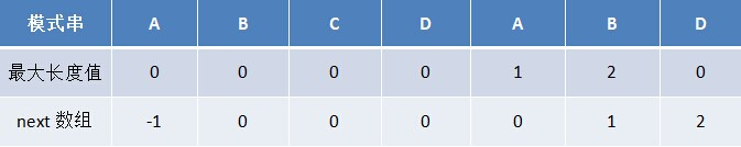- 由于next 数组是由最大长度值表整体向右移动一位(且初值赋为-1)得到的,那么失配字符的上一位字符所对应的最大长度值,即为当前失配字符的next 值。
