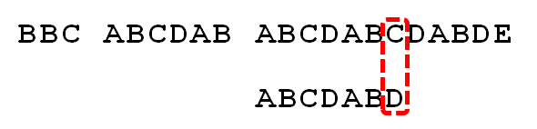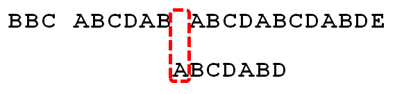 举个例子,如果给定文本串S“BBC ABCDAB ABCDABCDABDE”,和模式串P“ABCDABD”,现在要拿模式串P去跟文本串S匹配,整个过程如下所示: