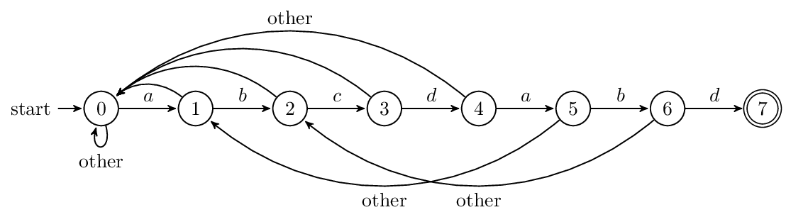 next 负责把模式串向前移动,且当第j位不匹配的时候,用第next[j]位和主串匹配,就像打了张“表”。此外,next 也可以看作有限状态自动机的状态,在已经读了多少字符的情况下,失配后,前面读的若干个字符是有用的。