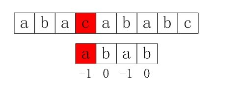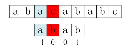 比如,如果用之前的next 数组方法求模式串“abab”的next 数组,可得其next 数组为-1 0 0 1(0 0 1 2整体右移一位,初值赋为-1),当它跟下图中的文本串去匹配的时候,发现b跟c失配,于是模式串右移j - next[j] = 3 - 1 =2位。