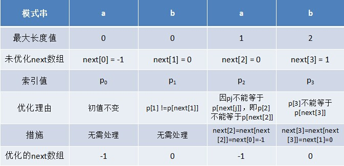 利用优化过后的next 数组求法,可知模式串“abab”的新next数组为:-1 0 -1 0。可能有些读者会问:原始next 数组是前缀后缀最长公共元素长度值右移一位, 然后初值赋为-1而得,那么优化后的next 数组如何快速心算出呢?实际上,只要求出了原始next 数组,便可以根据原始next 数组快速求出优化后的next 数组。还是以abab为例,如下表格所示: