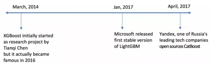- 2017 年 4 月,俄罗斯顶尖技术公司 Yandex 开源 CatBoost