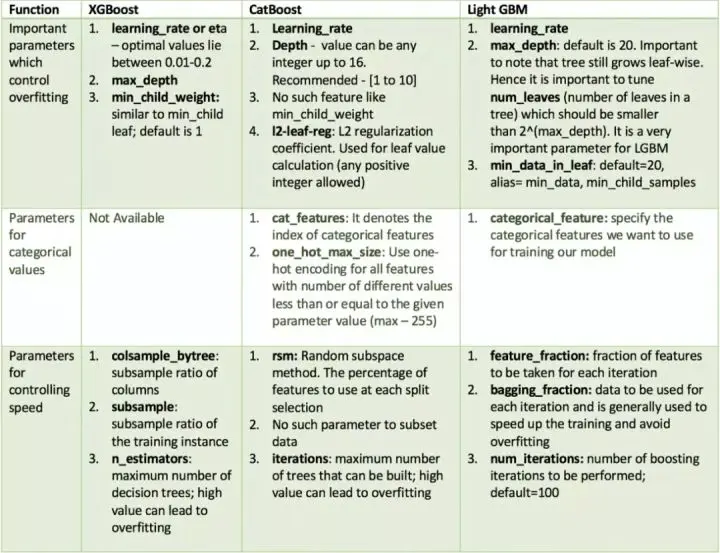 所有的这些模型都需要调节大量参数,但我们只谈论其中重要的。以下是将不同算法中的重要参数按照功能进行整理的表格。