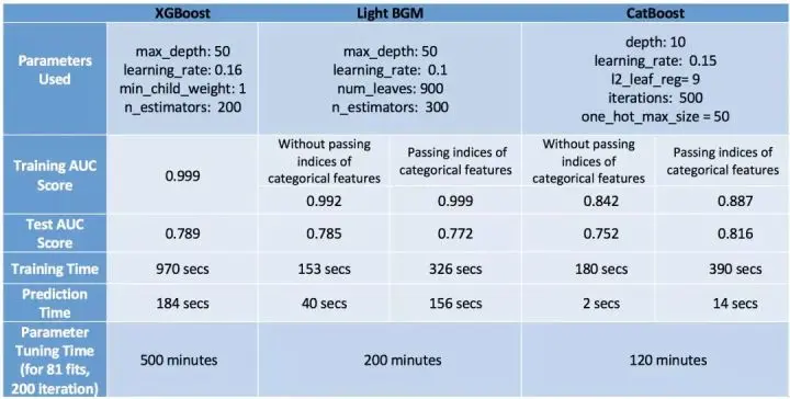 最后一个模型是 LightGBM,这里需要注意的一点是,在使用 CatBoost 特征时,LightGBM 在训练速度和准确度上的表现都非常差。我认为这是因为它在分类数据中使用了一些修正的均值编码方法,进而导致了过拟合(训练集准确率非常高:0.999,尤其是和测试集准确率相比之下)。但如果我们像使用 XGBoost 一样正常使用 LightGBM,它会比 XGBoost 更快地获得相似的准确度,如果不是更高的话(LGBM—0.785, XGBoost—0.789)。