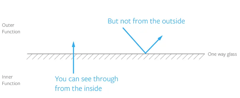 如果把作用域的机制可视化,你可以想象有一个双向镜(单面透视玻璃)。你能从里面看到外面,但是外面的人不能看到你。如图所示: