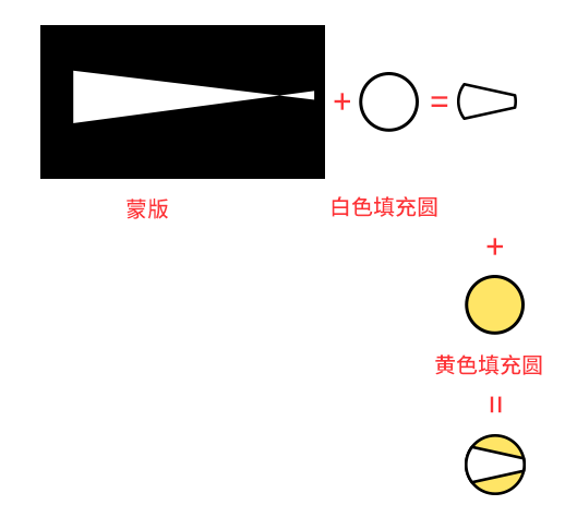 来看下效果,还不错,可以明显的看出来,黄色圆形的白色部分就是白色圆形使用了三角形剪切蒙版后的效果,最终只需要在最顶层叠加一个相同的三角形只有描边属性没有填充属性就可以了。