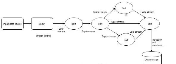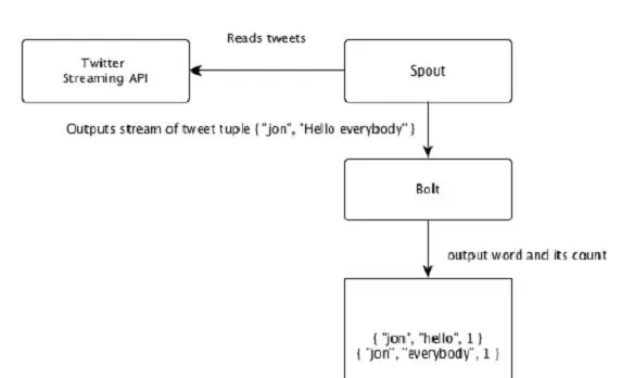 通过Twitter Streaming API为Twitter Analysis提供输入数据。Spout通过Twitter Streaming API读取数据,并以tuple流的形式输出。随后tuple将转发给bolt,bolt将会对tuple进行处理。