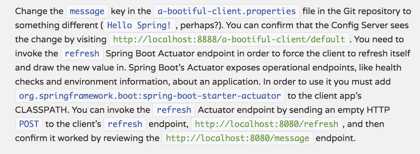 http://localhost:8888/a-bootiful-client/default来验证config服务器已经知道了改变,你需要调用refresh方法来强制客户端去获取新的值.......你可以通过使用post方法去请求http://localhost:8888/refresh来调用refresh方法,然后访问http://localhost:8080/message来验证是否生效。