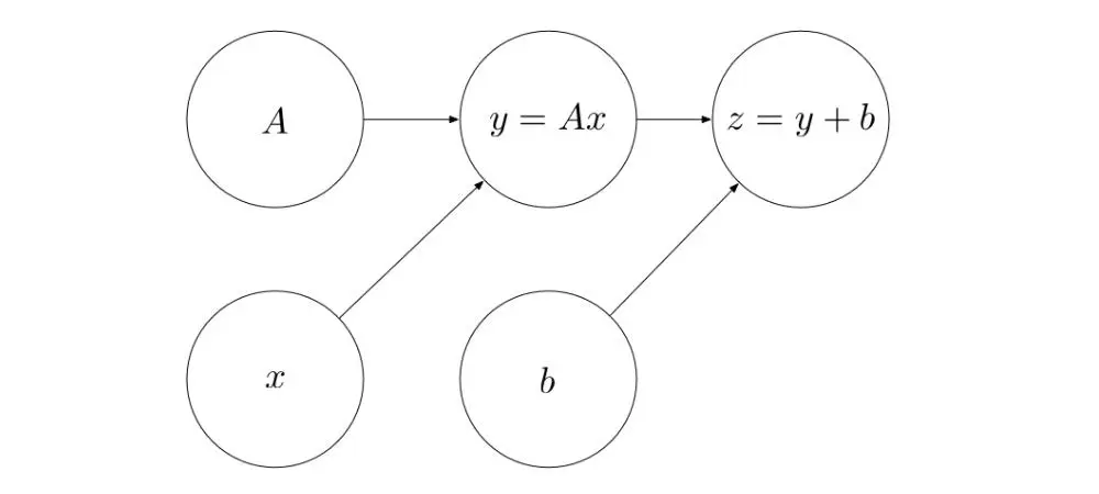 当计算变得越来越复杂时,computational graph 的概念就越显得重要了。比如,下面的 computational graph 定义了一个仿射变换: