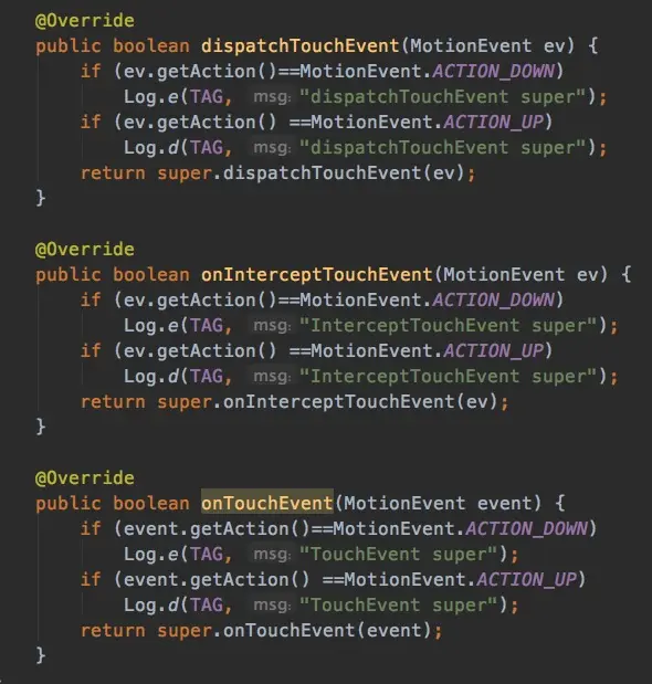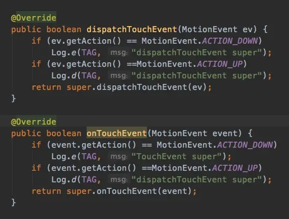 - 默认情况下,这些方法都是super(即父类的默认实现的)。所以先看一下默认情况下,一个ACTION_DOWN和ACTION_UP事件是怎么传递的。给最里面的View一个触摸,产生touch事件。