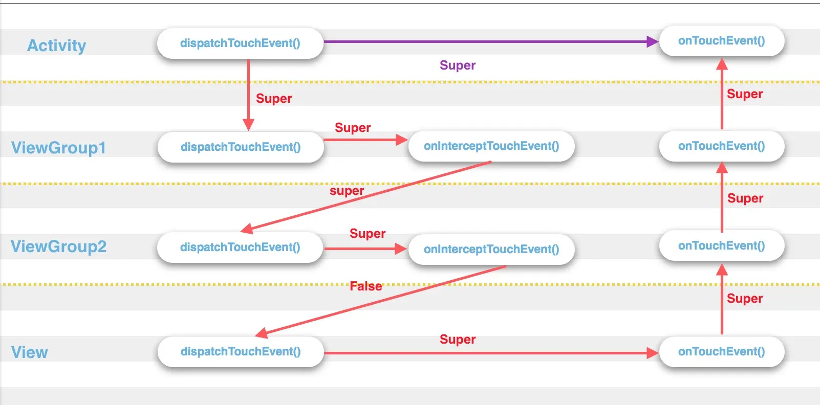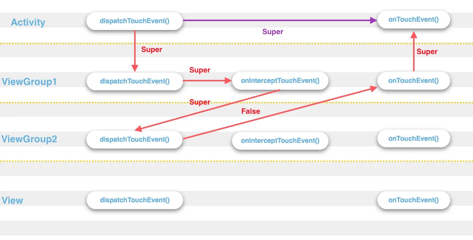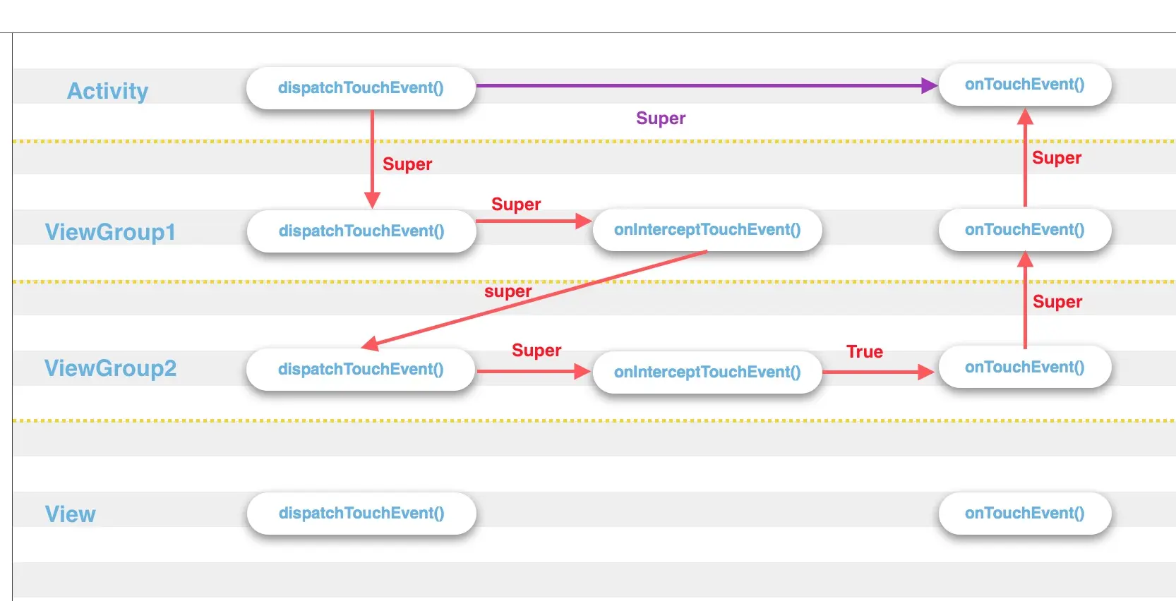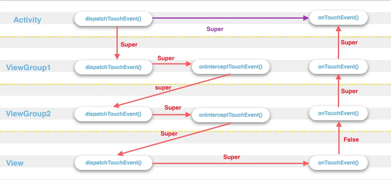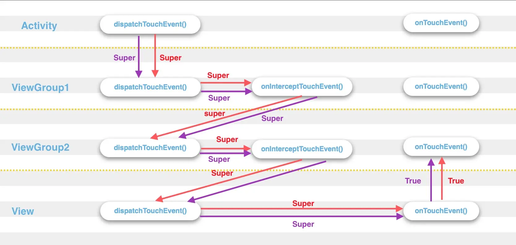 事件传递过程,可以用如下图来展示红色:ACTION_DOWN,紫色:ACTION_UP